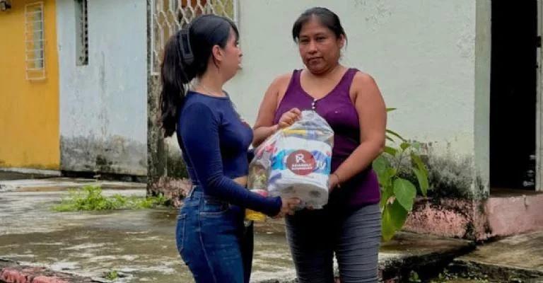 Imágenes compartidas en redes sociales muestran bolsas con la leyenda “Adanely Rodríguez” y el distintivo “AR” en colores guinda y blanco. Los apoyos fueron entregados en colonias donde decenas de viviendas se encuentran con afectaciones desde el fin de semana.